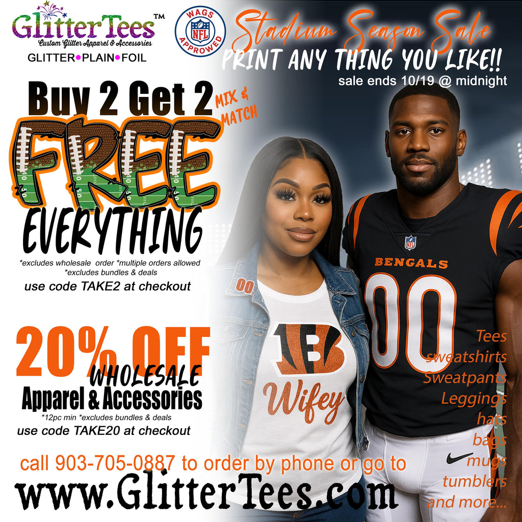 Skip the design process and shop our most-loved, ready-to-ship glitter tees — perfect for last-minute events, gifts, or game day looks. Fast shipping, no fuss, all glam.