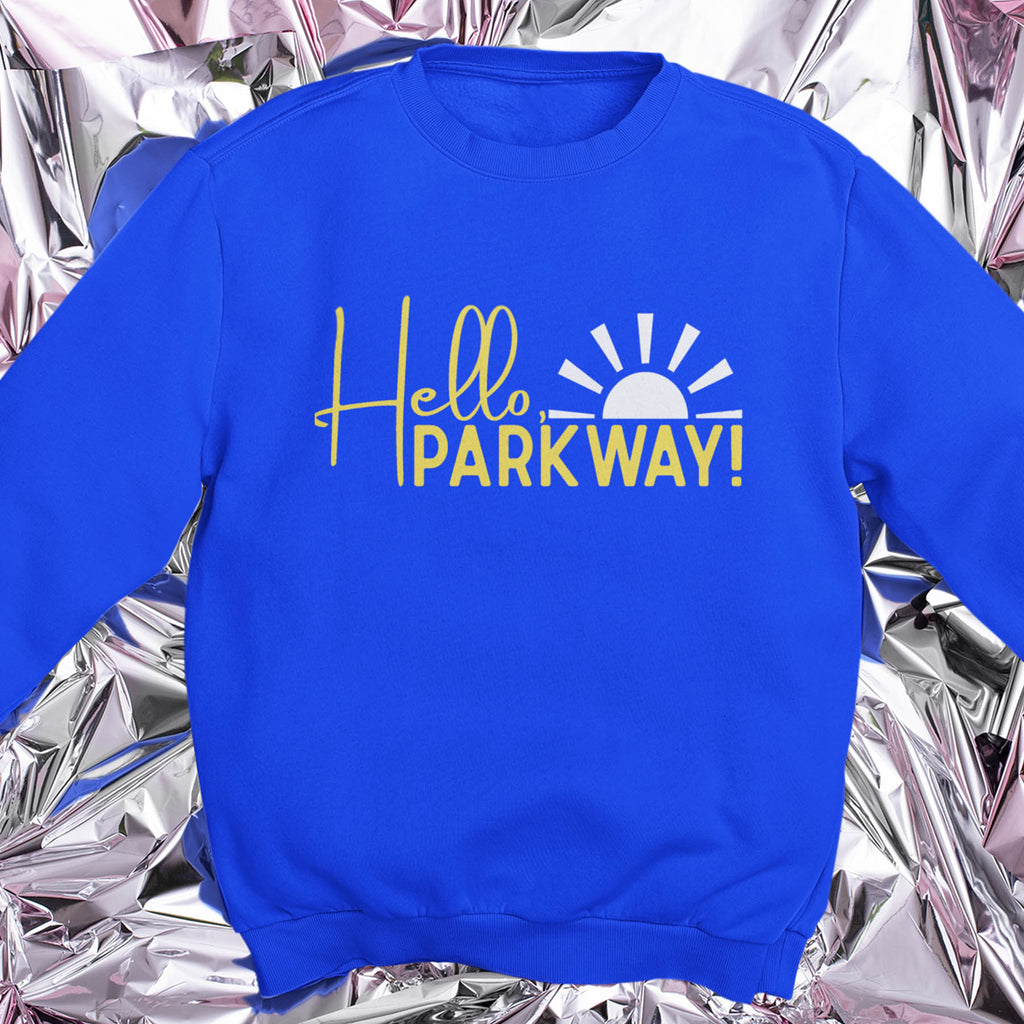 Stay cozy and show your school spirit with the Hello Parkway Blue Sweatshirt! Perfect for youth and adults alike, this high-quality sweatshirt features a crisp, plain print that keeps it stylishly simple. Whether you're heading to class or hanging out, its comfortable fit and vibrant blue color make it a favorite for everyone at Pinetree ISD. A fun, versatile addition to any wardrobe!